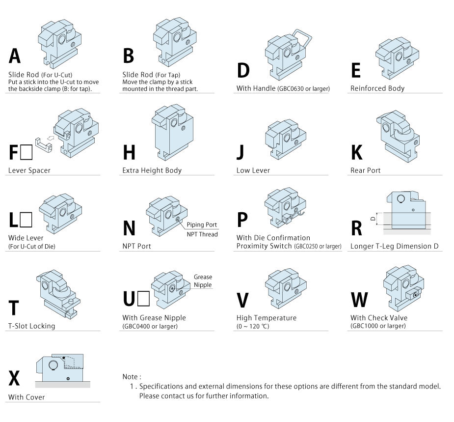 Lever clamp that slides in the T-slot by hand. Suitable for non-standardized die widths. Longer stroke allows for the variation in die clamping thicknesses.