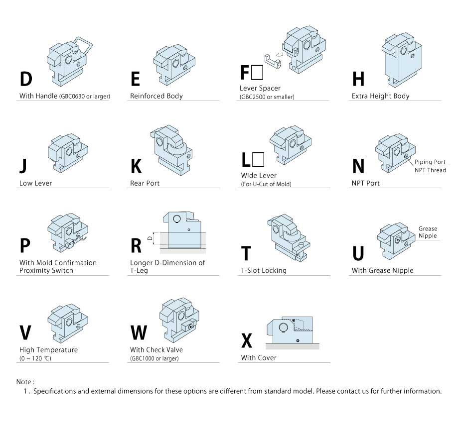 Lever clamp that slides in the T-slot by hand. Suitable for non-standardized mold widths. Longer stroke allows for the variation in mold clamping thicknesses.