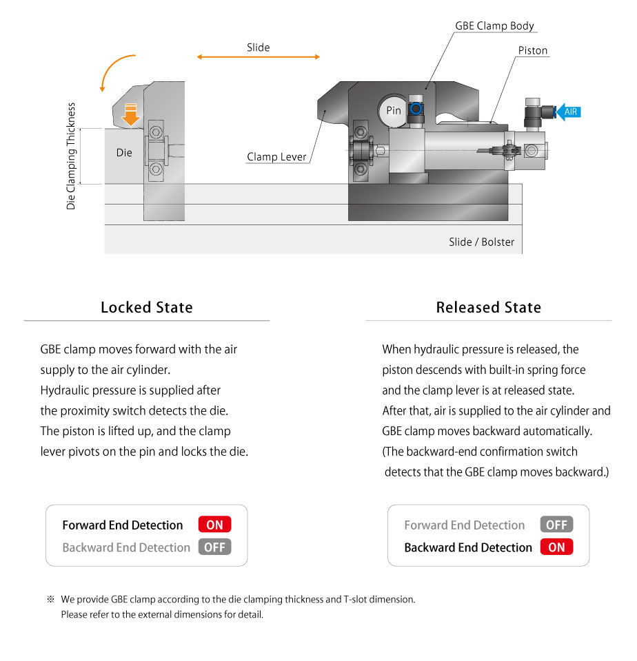 GBB clamp with an air cylinder that slides in the T-slot and locks the die automatically by remote control. Clamp movement is completely automated.