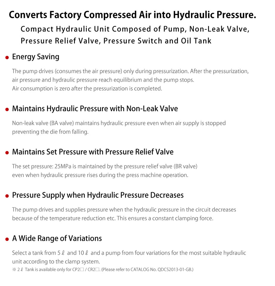 Powered by compressed air. Most suitable for hydraulic source of automatic clamp / RA Die Lifter. (5ℓ,10ℓ Tank Model)